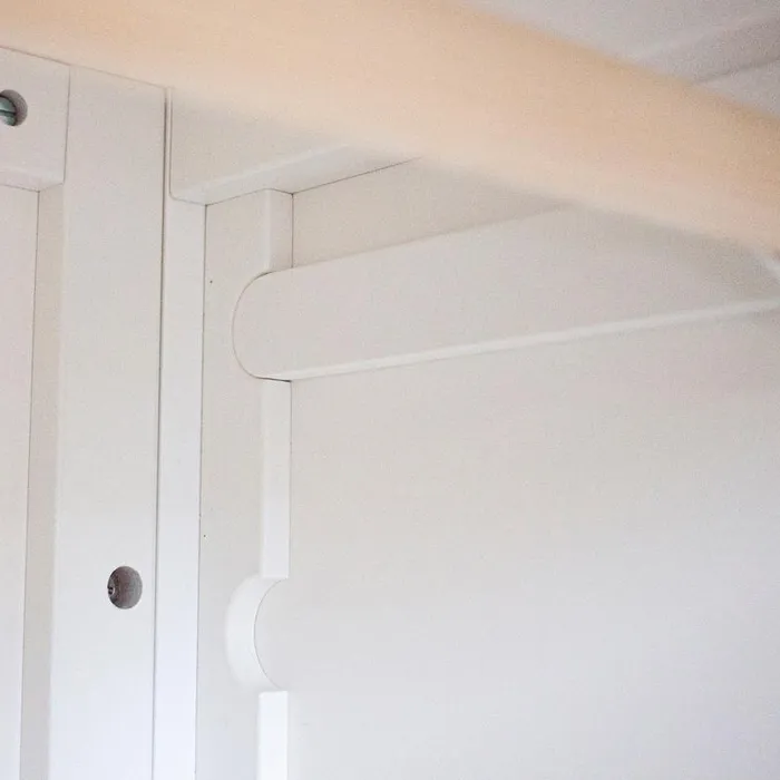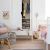 A gardróbszekrény tágas és polcrendszere személyre szabható, így pontosan akkora helyet hagysz a három polc között, amekkorára szükséged van, anélkül, hogy csavaroznod kellene. És akkor sem kell megkeresned a szerszámkészletet, amikor gyermeked már nagyobb és másféle tárolóhelyre van szüksége. Egyszerűen csak átrakod a két fa sínt oda, ahova kell, és ráhelyezed a polcot – egyszerűen és szerszámok nélkül!